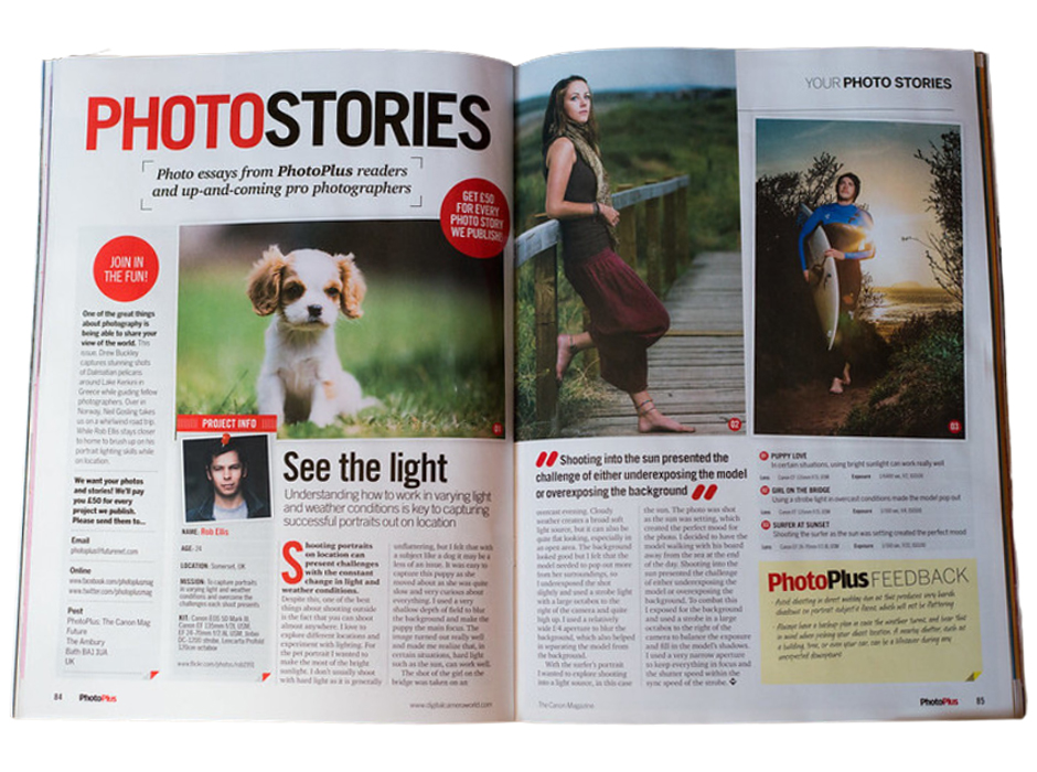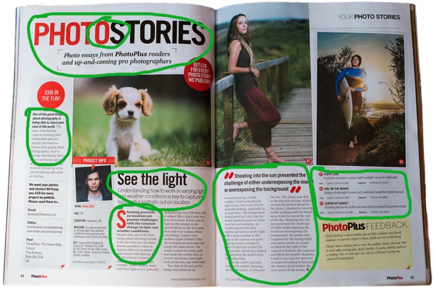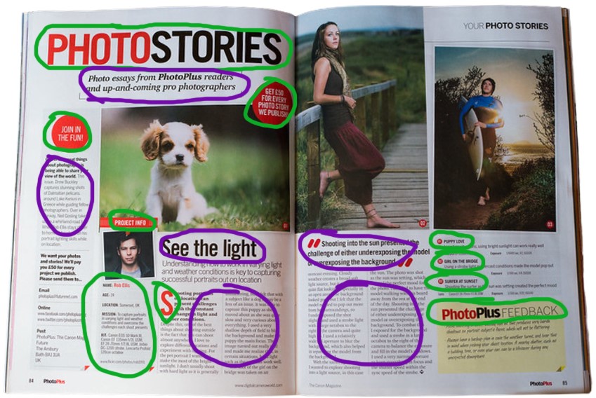 The above professionally designed spread was published by Photo Plus The Cannon Magazine, but the designer is unknown. The designer uses great design qualities throughout this spread. My analysis will show how this designer used typography strategically in their design as well as explain what elements of typography were contrasting to make this design easy for the viewer to follow. My analysis will also include how the photographer used the rule of Depth of Field. All of these elements work together to help make this spread successful.
