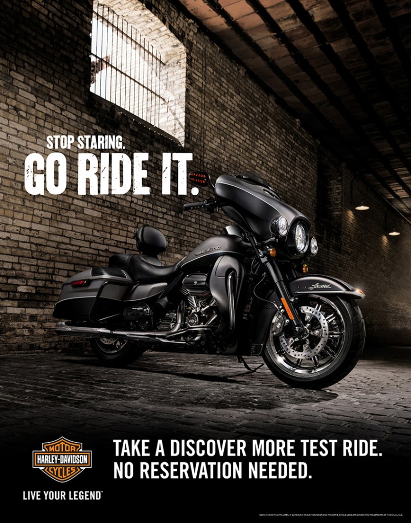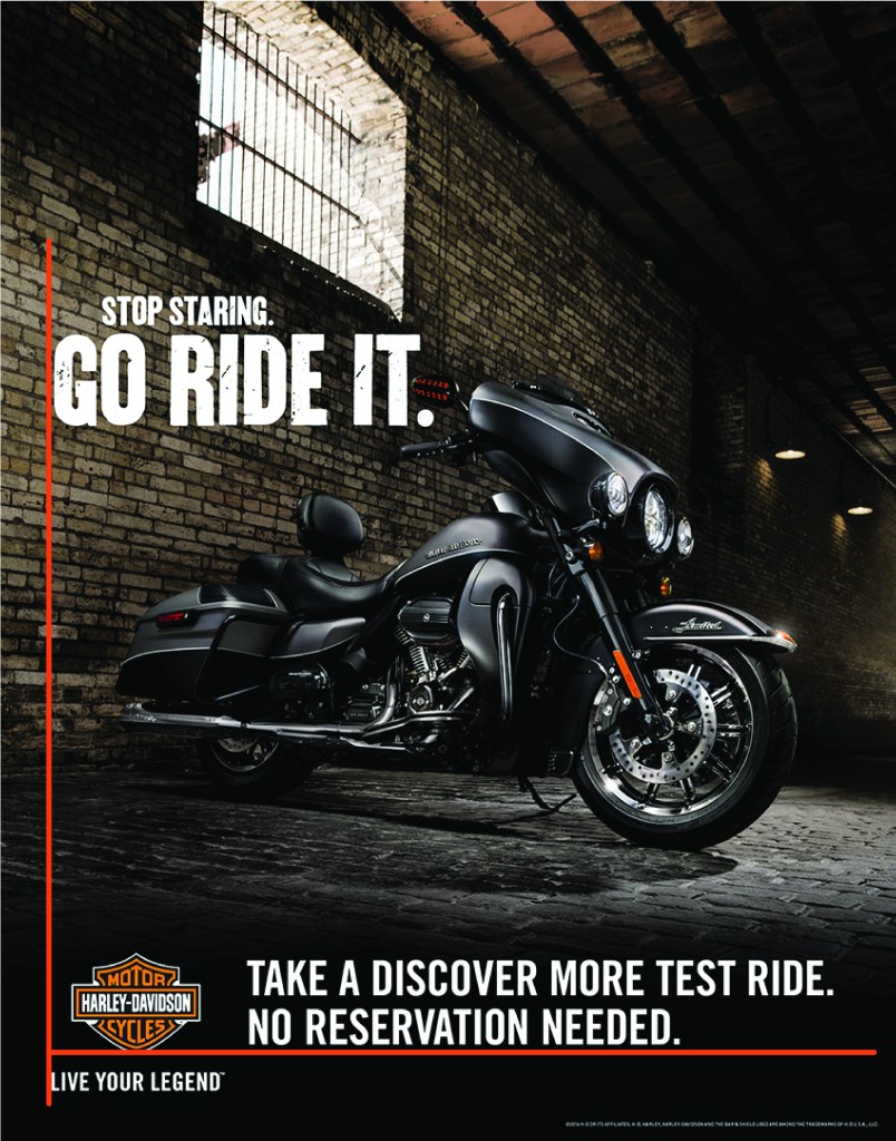 I designed the above ad to complement the original ad, but still have flexibility in the company’s product. The original advertisement was created to advertise Harley-Davidson’s announcement of the all-new Milwaukee-Eight engine – the most innovative, and most powerful in Harley’s 115-year history. However, the new ad is flexible for any of their motorcycles because it doesn’t name a specific type, but still has the overall feel and message of the company. I changed the image from an indoor image to an outdoor image to give another perspective of the product to help the viewer imagine the product differently. I will show how this new ad uses the same important design principles to work together to make this advertisement successful.