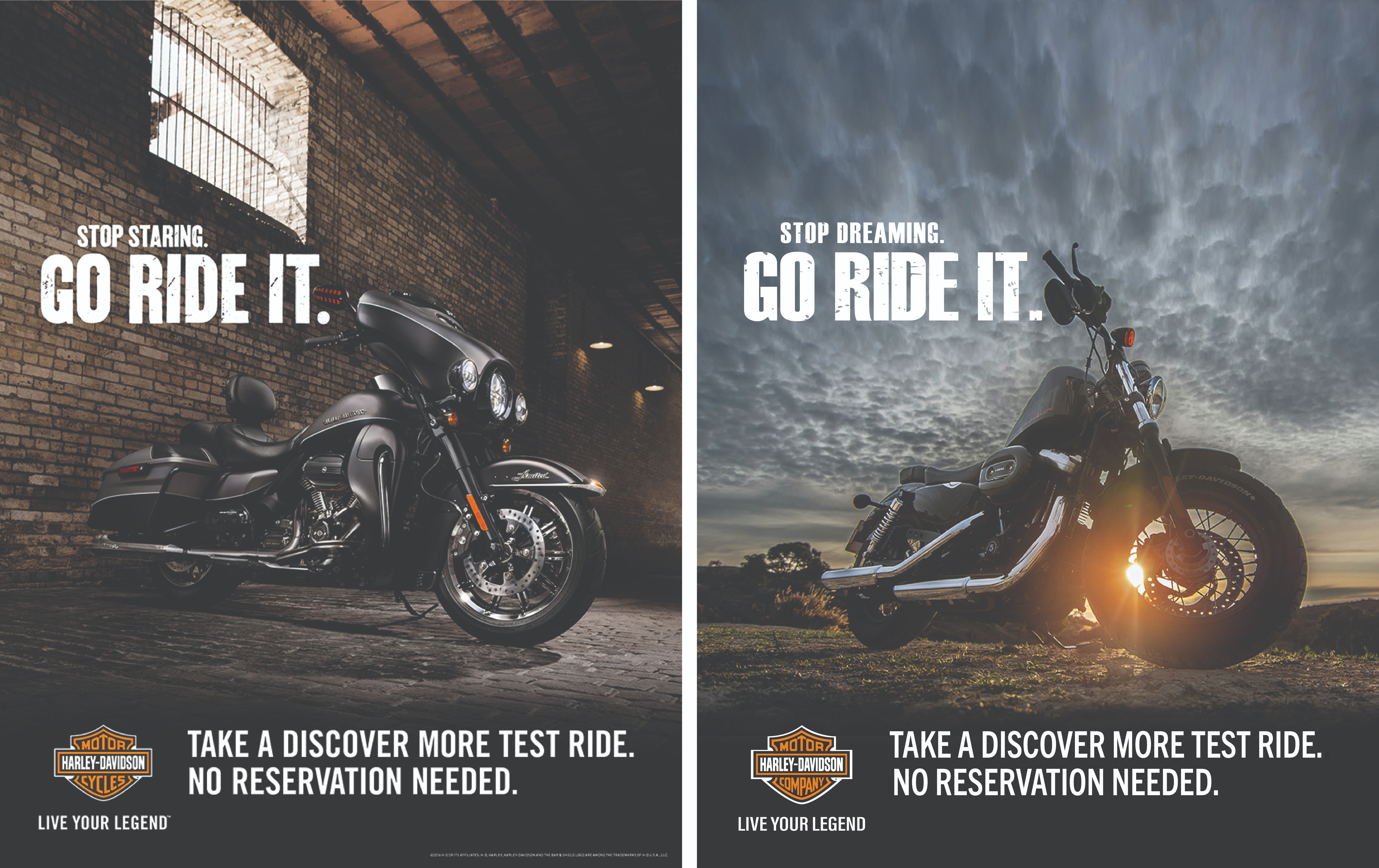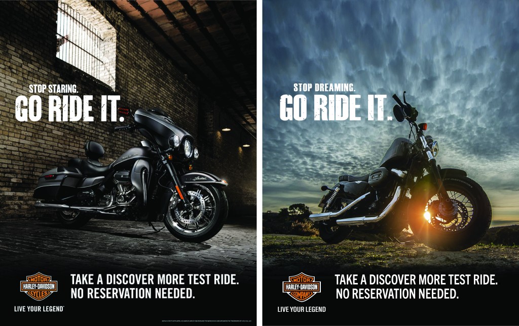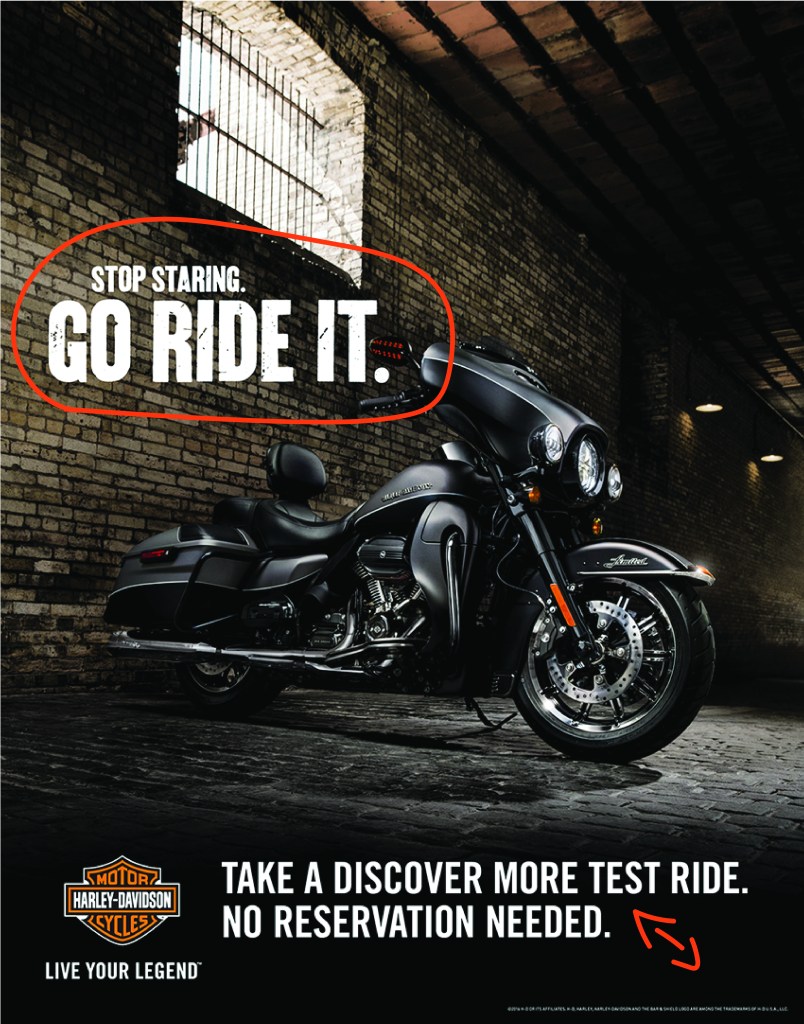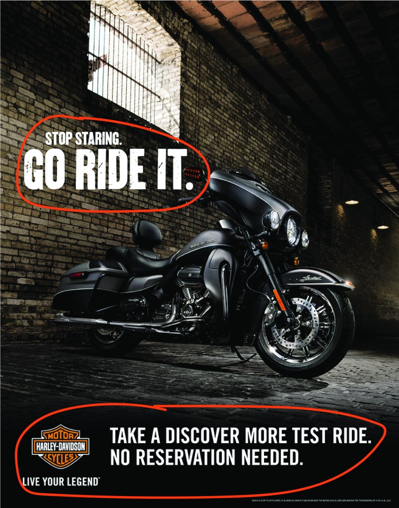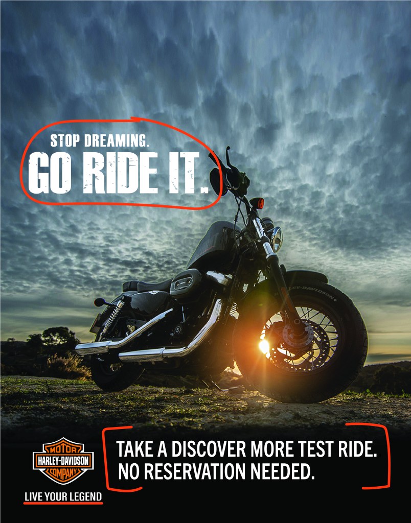 The above headline matches the original ad but with a slightly different perspective. Instead of Stop Staring, it says Stop Dreaming. People tend to relate dreaming with clouds. This helps convey the message from the image but keeps with the original headline that included Go Ride It. The typography is not only important in conveying the message to captivate its viewers, but it also adds visual hierarchy. I kept with the four main elements of headline, copy, call to action, and logo that should be used in a campaign ad. The headline is the first thing viewers will notice. It’s bold and large and will capture the attention of viewers. The distressed look of the headline matches the original campaign ad which as said earlier, gives the headline character and matches the design and feel of the company. The bottom copy and call to action are clean Sans Serifs as in the original ad which is easy to read, but short, simple statements viewers understand.