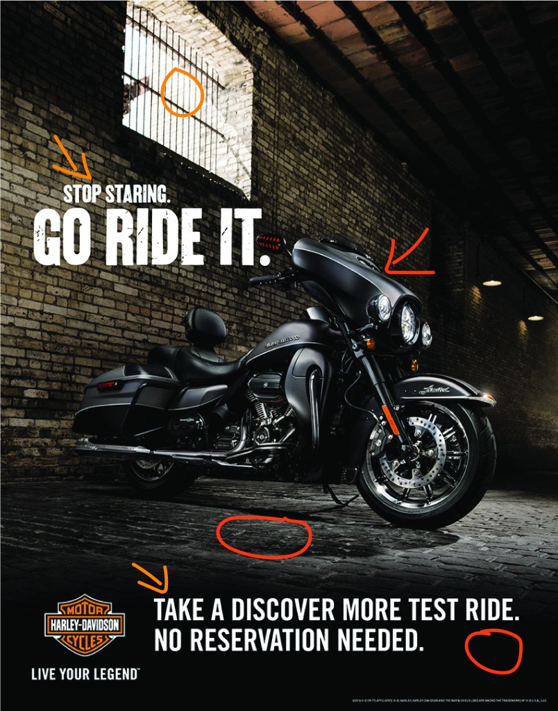 The designer used the branding colors of the company for the viewers to identify with this brand. Harley-Davidson’s brand uses orange, black, and white in its logo and all of its branding. It was highly appropriate to use those colors as a basis for this campaign ad. These are also contrasting colors that compliment each other very well making it easy for the viewer to look at and understand. The image used white in the window, but dark in the rest of the image making it easier to add white in contrast for the type. The black motorcycle, dark shadows complemented the black strip on the bottom where the type could have a stronger bold contrast for the viewer. All colors complement each other very nicely.